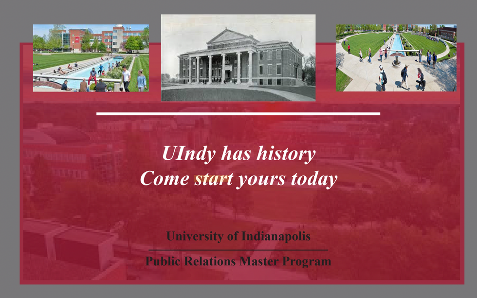 A collection of promotional materials including University of Indianapolis Public Relations Masters Program logo, AthLead Indy track and field promotional flyer, and more.